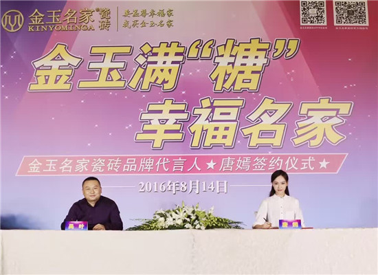 嘉華明星經紀公司根據金玉名家陶瓷的企業文化及市場定位,在眾多明星當中,金玉名家與嘉華明星經紀公司一致認為唐嫣是金玉名家代言人的不二人選,于8月14日,在北京JW萬豪酒店舉行金玉滿“糖” 幸福名家 金玉名家瓷磚品牌代言人唐嫣簽約儀式。我們相信,金玉名家與唐嫣的攜手合作,是金玉名家瓷磚品牌鑄就新篇章的開始,對于市場的開拓有極大的幫助,預祝金玉名家銷售長虹,唐嫣演藝事業蒸蒸日上。