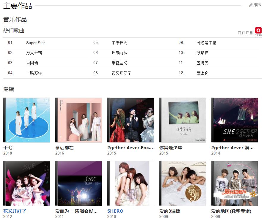2000年共同參加《宇宙2000實力美少女爭霸戰》后受華研國際音樂相中并簽約。2001年9月11日發行首張專輯《女生宿舍》正式出道,憑借此專輯入圍第13屆臺灣金曲獎最佳新人獎 。2002年發行專輯《美麗新世界》并獲得第十四屆臺灣金曲獎獲得最佳重唱組合獎。2003年發行專輯《Super Star》入圍在第十五屆臺灣金曲獎最佳重唱組合獎 。2004年發行專輯《奇幻旅程》入圍第十六屆臺灣金曲獎最佳重唱組合獎 ,同年舉行首場世界巡回演唱會。2005年發行專輯《不想長大》入圍第十七屆臺灣金曲獎入圍最佳重唱組合獎 [8] 。2006年舉辦《S.H.E移動城堡世界巡回演唱會》。2007年發行專輯《Play》,憑借專輯主打曲《中國話》首次登上央視春晚表演。2008年發行專輯《我的電臺FMS.H.E》。2009年舉辦《S.H.E愛而為一世界巡回演唱會》;2010年發行專輯《SHERO》并宣布單飛不解散。2012年發行專輯《花又開好了》。2013年受中央電視臺春節聯歡晚會邀請并獻唱歌曲《SHERO》,3月舉辦巡回演唱會《2GETHER 4EVER 世界巡回演唱會》。2014年舉行《2GETHER 4EVER世界巡回演唱會安可場》 。2015年為內地電影《少年班》獻唱主題曲《你曾是少年》。2016年8月推出EP《永遠都在》。