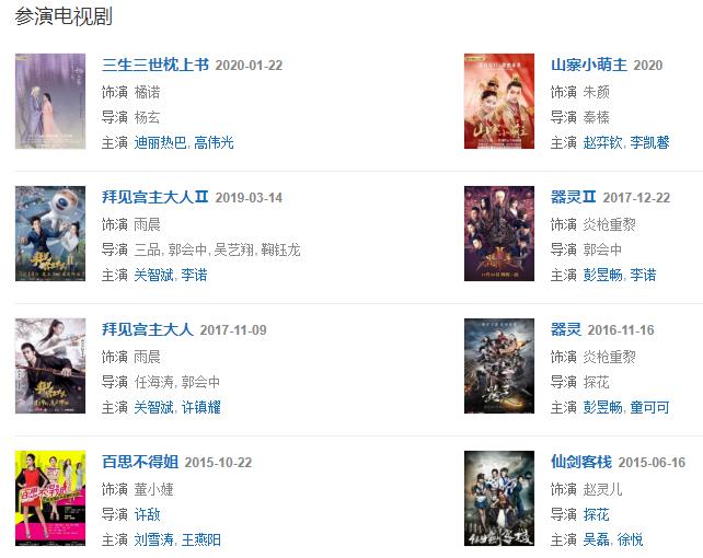 2020年1月22日,她與迪麗熱巴、高偉光合作出演的仙俠劇《三生三世枕上書》在騰訊視頻播出;3月13日,她主演的神話片《封神榜·妖滅》在愛奇藝視頻上映,片中飾演美麗善良,充滿愛心的妲己。